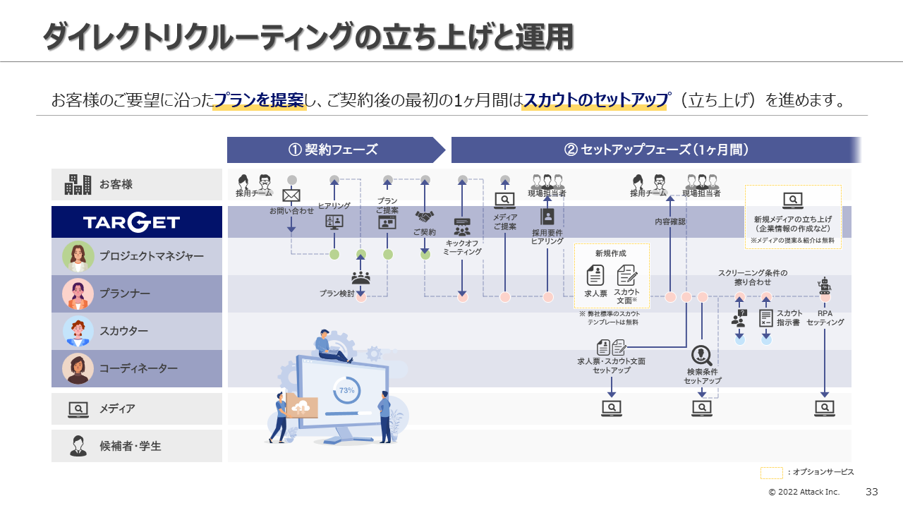 弊社では、採用支援サービス『TARGET』を展開し、ダイレクトリクルーティングをゼロからサポートしています。これまで、大手上場企業からスタートアップ企業まで、幅広い規模・業界での実績があります。 お問い合わせ、お待ちしています!