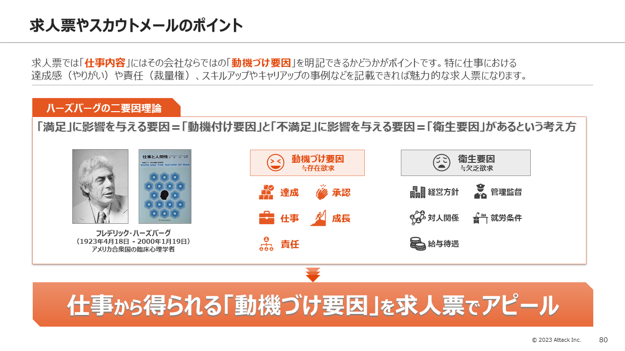 候補者ターゲットやメールの件名、本文の見直しを検討します。転職意思のあるアクティブな候補者にメールを送っているか、求人に合致した候補者にスカウトメール送っているかを再確認します。また、メールの件名や本文冒頭3行にこだわり、読みたくなるメールにする工夫も必要です。例えば「●億円の資金調達」「フルリモート」「年収●●万円以上確定」などといった衛生要因(※1)で興味を引き付けるのが効果的です。