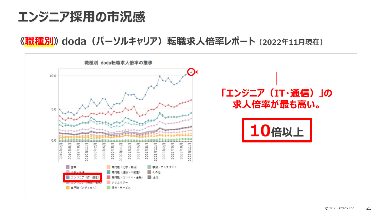 2022年11月現在、doda(パーソルキャリア)転職求人倍率レポートによると、全業界・全職種の求人倍率の平均は2.23倍となっています。そこから、業種別で見ると「IT・通信」「人材」「コンサル」の3業界が平均約6〜8倍、さらに職種別では「エンジニア(IT・通信)」の求人倍率が10倍以上となっています。これは、1人のエンジニアを10社で取り合っている状況であり、完全に需給バランスが崩壊しているといえます。
