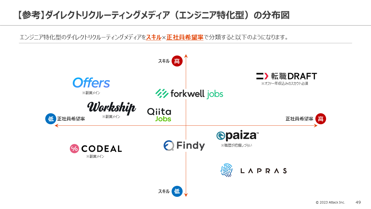 アクティブな候補者が圧倒的に多いのは、BIZREACHです。候補者全体で約30万人、エンジニア層に限定しても約46,000人います。その次に多いのはGreenです。ITエンジニア特化型のメディアもありますが、現状は登録者数があまり多くありません。よって、すぐにスカウト候補者が枯渇する傾向にあります。