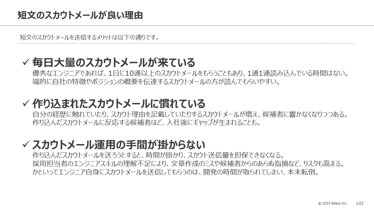 ダイレクトリクルーティングが珍しかった時代は、多くの候補者にとってスカウトメールが届くことは嬉しいことでした。ですので、候補者の経歴に触れたような、一通一通作り込んだスカウトメールが効果的でした。しかし、現在はスカウトメールが目新しいものではなくなり、スカウトメール文面作成に時間をかけても、あまり効果が得られなくなっています。むしろ、短文の方が好まれ、読まれる傾向にあります。