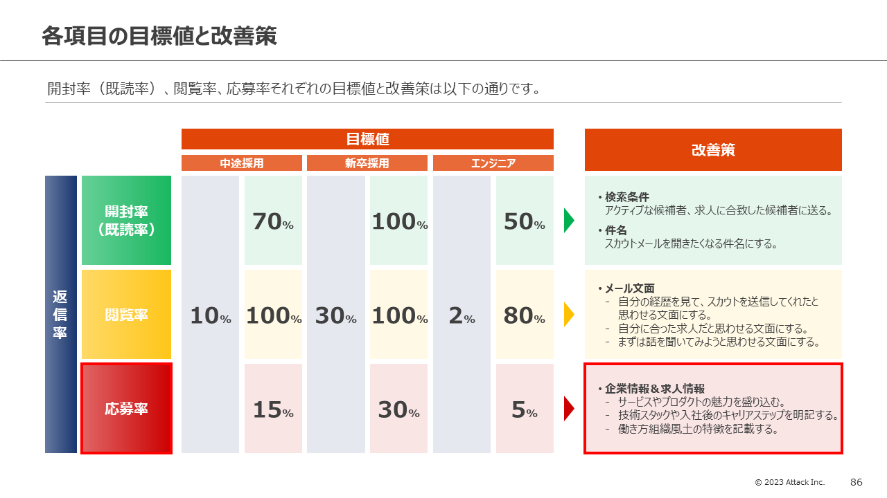 閲覧率を上げるには、スカウトメールの文面を工夫します。経歴を見た上でのスカウト、自分に合った求人だと思ってもらうことです。また、最初はカジュアル面談などを設定し、返信のハードルを下げます。応募率を上げるには、企業情報と求人票のブラッシュアップが必要です。サービスやプロダクトの魅力、技術スタックや入社後のキャリアステップ、働き方や組織風土の特徴といった観点を盛り込みます。