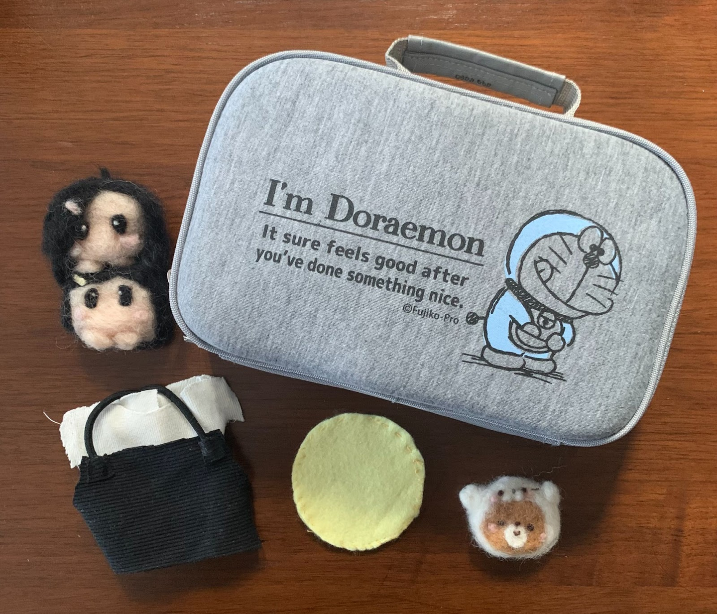 ▲娘の裁縫セットと最近の作品(コースターと、お人形の洋服、羊毛フェルトはキットのものと、私の誕生日に作ってくれた娘と私)。最近は、自ら早めに宿題を終わらせて手芸をする時間を作るようになりました(櫻井)