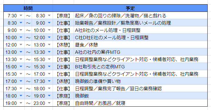 午後は日程調整の業務を中心に行い、社内ミーティングにも参加します。お客様によって対応ルールが異なるので、お客様ごとに時間を区切って対応していきます。
