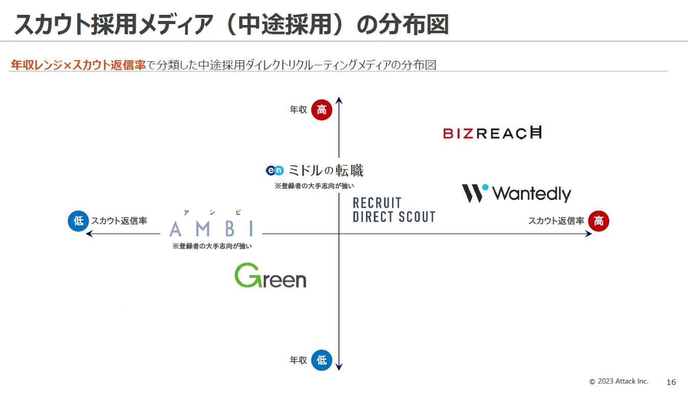 まずは中途採用でよく使われるメディアを「年収」と「スカウト返信率」で分布し、各メディアの特徴をご紹介しました。