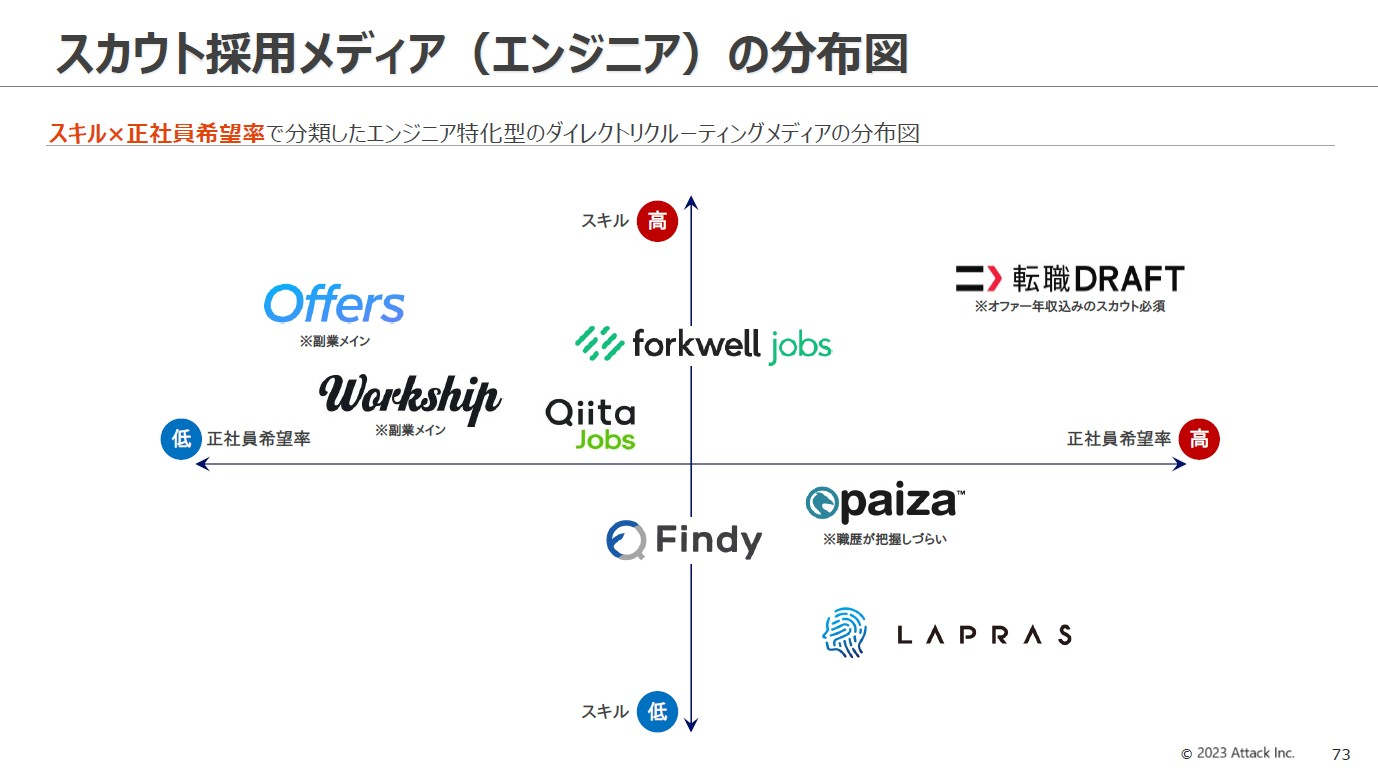 採用“広報”メディアとして展開されています。候補者層の年代は20〜30代、職種は営業、エンジニア、クリエイティブが多いです。経験豊富なエンジニアやサービス業のスタッフ採用にはあまり適していないでしょう。圧倒的に利用が多いのは、IT企業やベンチャー企業です。