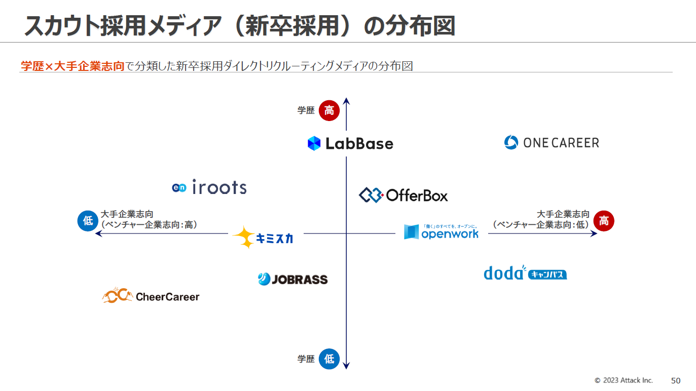 新卒採用におけるスカウトメディアの草分け的存在です。直近の利用企業数は1万社以上、23卒の登録者数は20万人以上。候補者の学歴は比較的高く、65%が文系、学科は多種多様です。最近は大手企業の利用が増えてきており、中小企業の採用活動は少々厳しくなりつつあります。