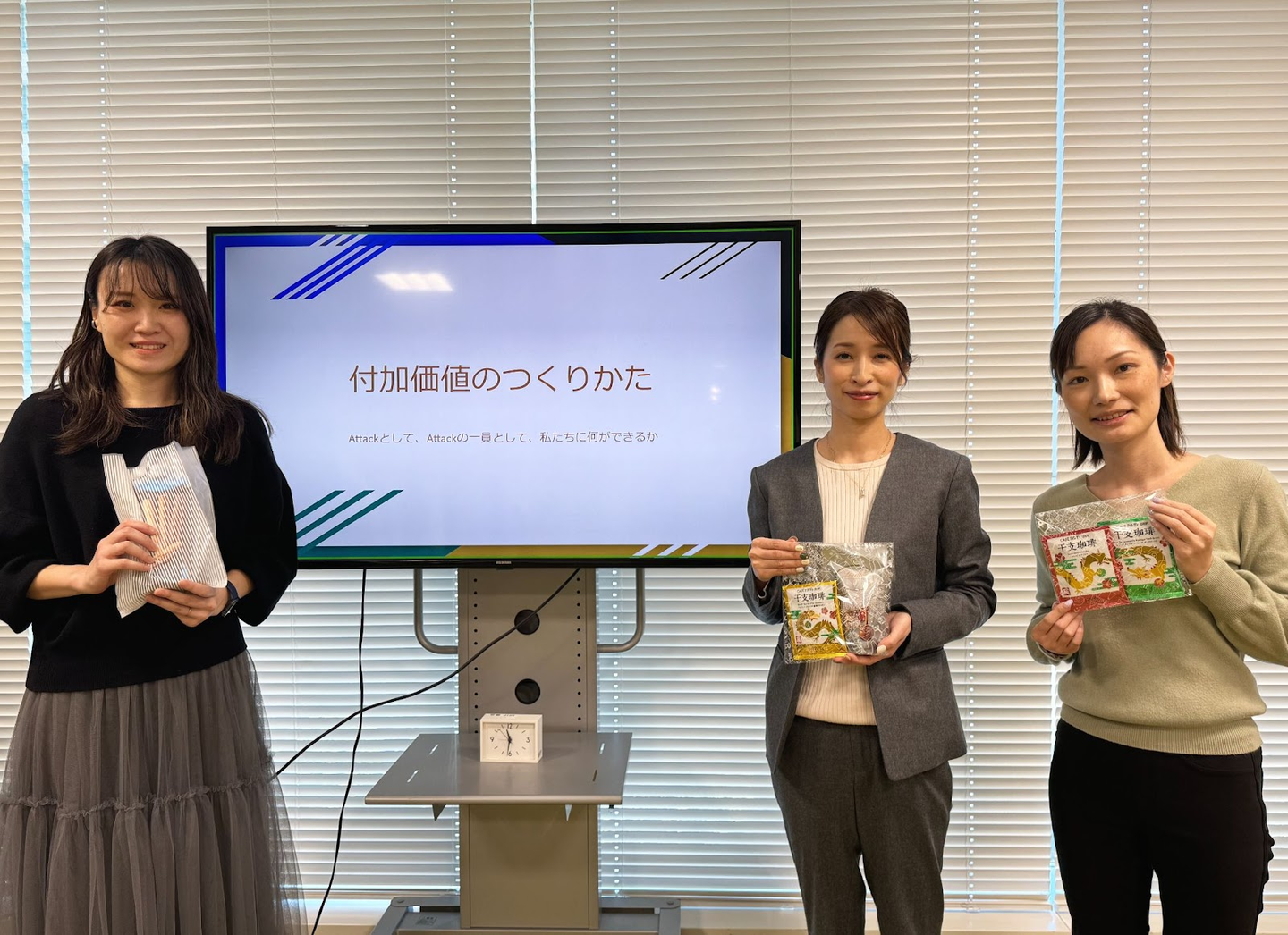 まず、社内ナレッジの結果発表からご紹介します。第1位は、コーディネーター山中 里奈の「付加価値の作り方」。 仕事の付加価値とは何か、価値の種類について、そして潜在的なニーズを掘り起こし感情を動かす価値を生み出すために起こすべき行動をまとめたもので、メンバー全員に気づきを与え多くの支持を集めました! 第2位は、日々の業務を洗練させるための方法を具体的にまとめたオペレーター小鮒 瑠初の「仕事効率化」。第3位は、ゴールを明確化することで仕事の質を高める方法をまとめたオペレーター谷合 あずさの「時間管理術」と続き、選ばれた3名には会社から新年にちなんだギフトが贈られました。