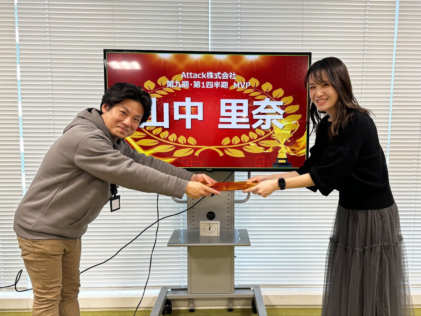 続いてMVPの発表です。社内MVP、通称「Attack No.1」は、役員やマネージャー以外の正社員、契約社員、アルバイト全員を対象に、前四半期において、価値発揮、組織貢献したと思うメンバーを社内投票によって選出します。