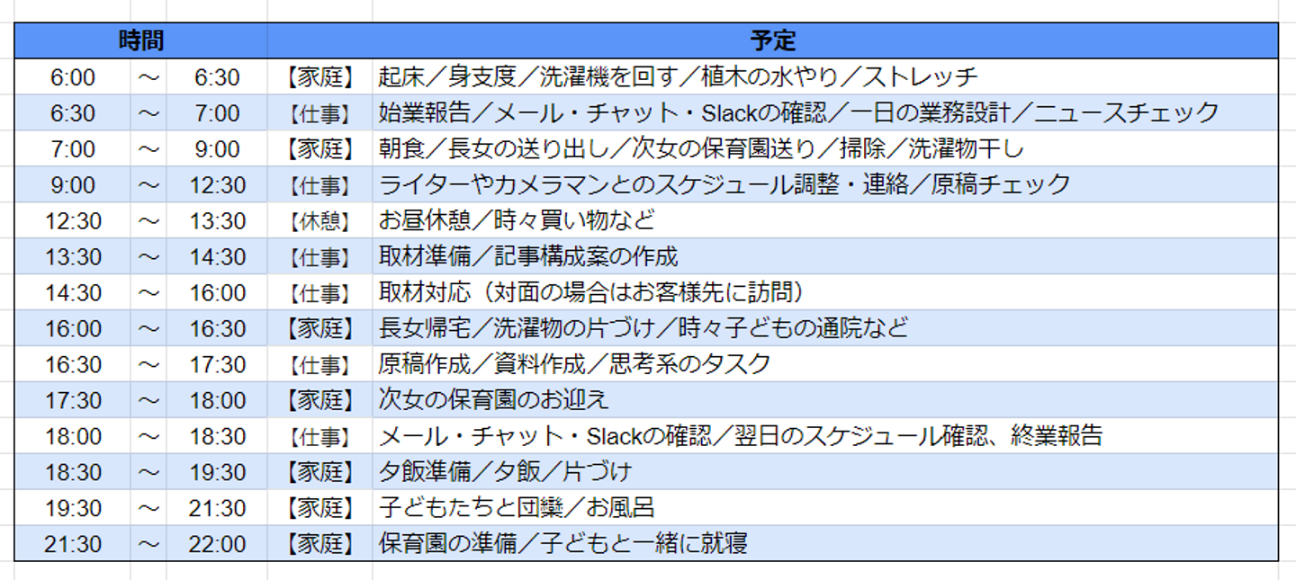 朝6時頃に起床して、6時半~7時頃に一度パソコンに向かうようにしています。早いと思われるかもしれませんが、朝方の生活なのでこの時間にタスクを確認できると気持ちに余裕も生まれますし、その日のリズムが整うように感じています。一緒に子どもが起きてきてしまうと難しいので、起こさないように気をつけていますね。
