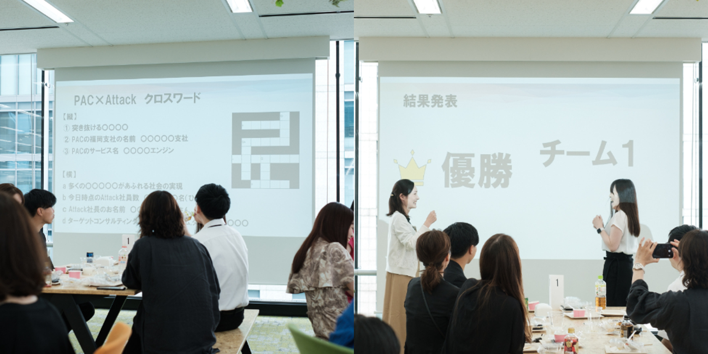 ここからは各テーブル、ポイント制で対決するクイズタイムに。 まずはタレントパレットの「生成AIを活用して社員の紹介文を作成できる」新機能を利用して作成された、PAC社員の方のプロフィール文から実際にご本人を当てるクイズが出題。Attackのメンバーは全問正解を目指して、ヒントもいただきながら取り組みました。