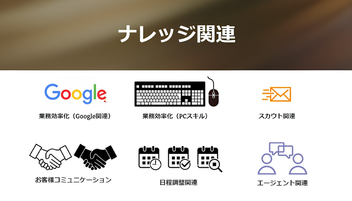 情報共有のため社内で活用している「ナレッジ共有シート」 には、業務効率化のためのPCスキルといったベーシックなものから、媒体運用のノウハウ、エージェント対応といった採用業務にまつわるもの、さらに”ミスを防ぐ方法“ や ”お客様とのコミュニケーション方法“ といった、個人が試行錯誤することによって発見した応用的なナレッジまで、幅広い情報を集約。社内のだれもが見られるようになっています。