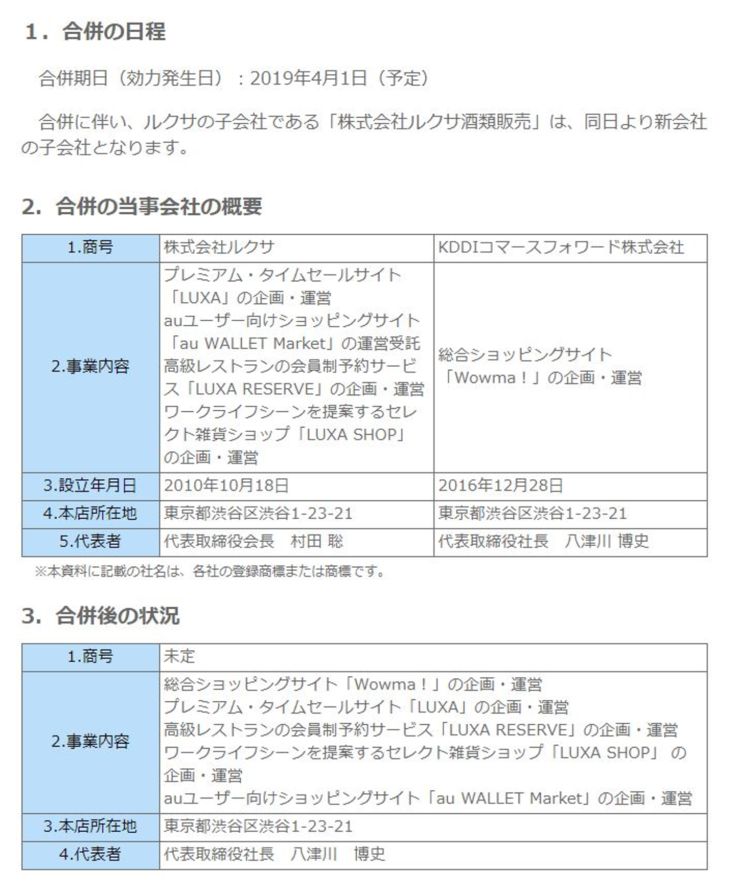 株式会社ルクサ(本社:東京都渋谷区、代表取締役会長 村田 聡、以下 ルクサ)とKDDIコマースフォワード株式会社(本社:東京都渋谷区、代表取締役社長:八津川 博史、以下 KCF)は、2019年4月1日(予定)をもって合併します。
