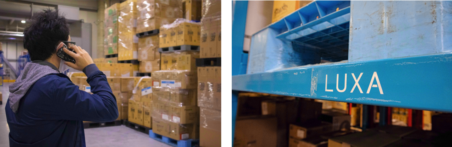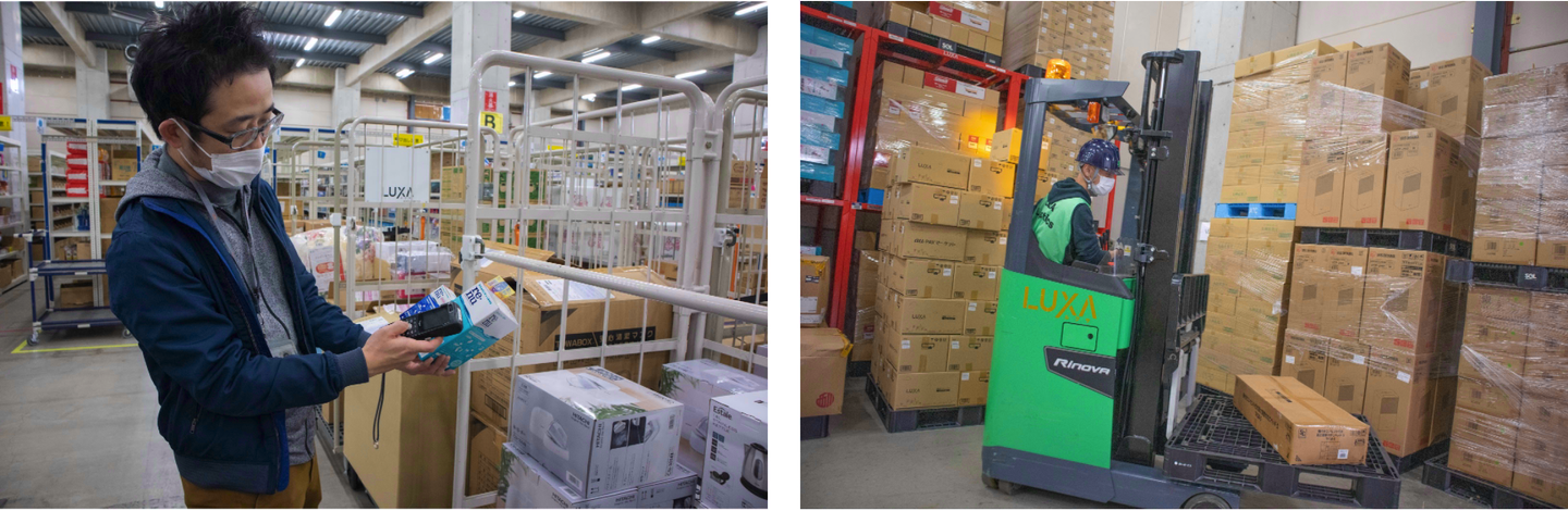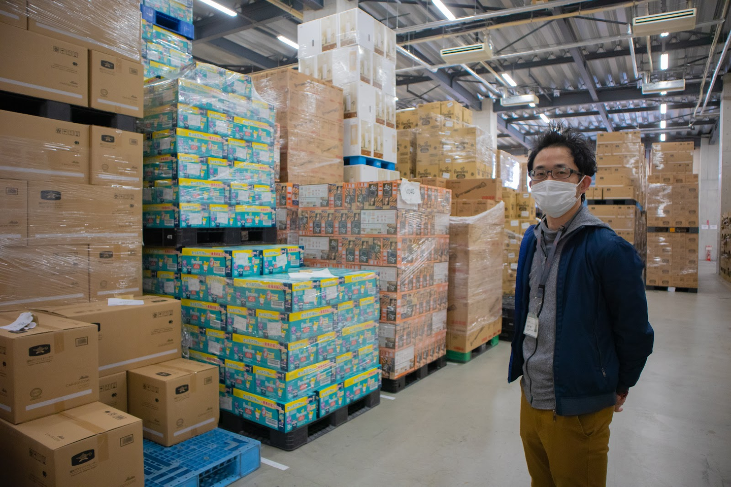 現在茜浜LCでは小〜中型商品が約36万ピース、SOSiLAでは飲料などの重量物をメインに約10万ピースの在庫を保管しています。延床面積は合わせて5,330坪、サッカーコート2.5面分になる広さの中、ロジスティクス部のメンバー○名と委託先のワーカーさん50名ほどで日々商品の入荷・検品・梱包・発送業務を行っています。