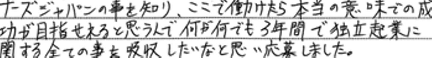 ここで働けたら本当の意味での成功が目指せれると思うんで何が何でも3年間で独立起業に関する全ての事を吸収したいなと思い応募しました。