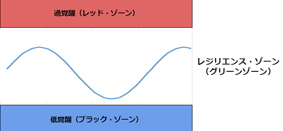 交感神経が強く働くレッドゾーン(過覚醒)、副交感神経が強く働くブラックゾーン(低覚醒)、そしてちょうど間のレジリエンス・ゾーンです。