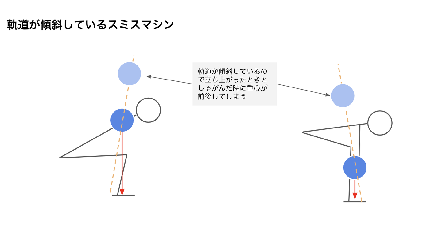 使っていたスミスマシンをよく見てみると、軌道を確保しているバーが傾斜しているタイプでした。床に垂直に軌道のバーが付いていれば良いのですが、斜めになっているので、スクワットで立っている時に調整していたバランスが、しゃがんだ時には、バーがやや後方に移動するために踵側に回転を感じていたのです。また、デッドリフトでも、バーを下ろした状態で調整していた立ち位置が立ち上がった時にバーが僅かに体に近づいていたので、後方に押し出され踵側に体重を感じるようになっていたのです。