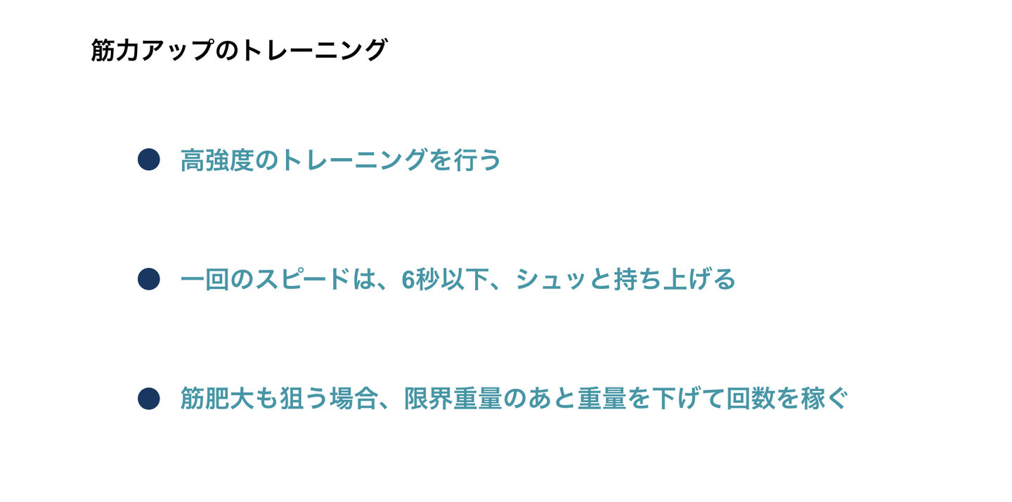 なので、例えばスクワットであれば、立ち上がるときにゆっくり立ち上がるのではなく、シュッと素早く立ち上がる方が筋力アップに効果的であるといえます。でも高強度の時にシュッといくのは難しいですよね。6秒以下ですので思ったよりゆっくりでも大丈夫です。