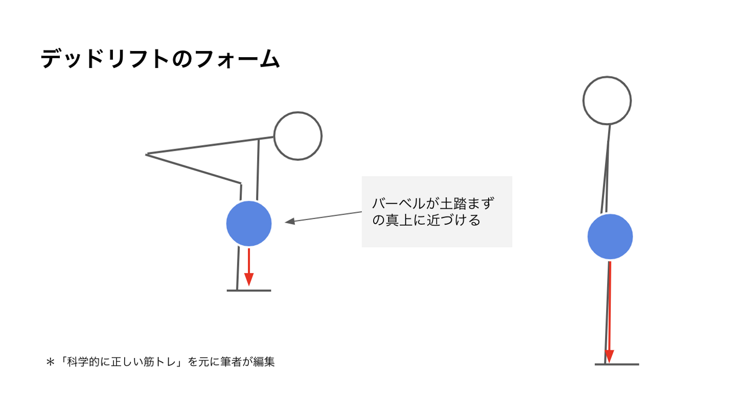 デッドリフトは、スクワットと同様にシンプルです。足を伸ばして腰を高い位置に保ったままバーのすぐ近くに立ちます。そのまま手をだらんとさせて肩幅より少し広くバーを持ちます。この状態で足裏に回転を感じていないことを確認します。そのまま、足裏に回転を感じない状態でバーを膝を伸ばしながら持ち上げ、股関節を前に押し出して気をつけの姿勢になります。