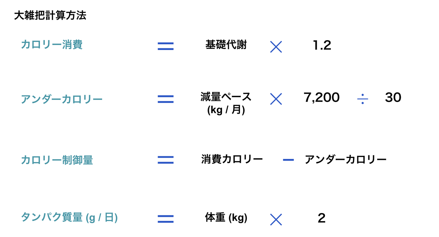 30代70kgの基礎代謝は、1600kcalくらいで、その他のカロリー消費で、20%くらいの320kcalくらいと言われてますのでこれで概算します。毎月2%減量しながら筋肉を維持していくとなると、脂肪1.4kgあたり10,080 kcalなので、1日あたりカロリーを336kcal 不足させると落とせる計算です。カロリー消費合計が、1920kcal なので、1日のカロリー摂取を1564kcalに設定しておけば、月に1.4kgくらい減らせます。ここでは、キリよく1500kcalにしました。体重減少スピードが思ったよりもスローペースに見えると思いますが、カロリー制限をきつくすると続かなそうだったので、このくらいで良しとしました。体重も始めた時はもっと重く、だんだん軽くなって行きますが、大体この計算通りに減っていきました。
