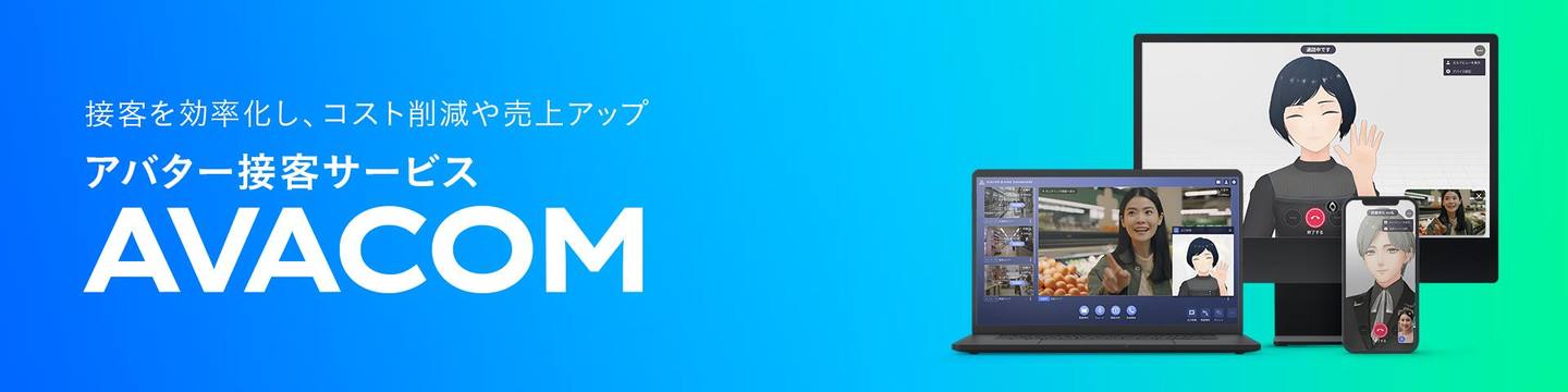 「AVACOM」は、アバターやAIで接客を効率化する、オンライン接客サービスです。マルチプラットフォームに対応しており、AIの活用やリモート接客(遠隔接客)により、WEBサイト上でのオンライン接客による売上・契約増加や、問い合わせ効率の向上、店舗や受付の無人化・省人化、人手不足の解消に貢献します。