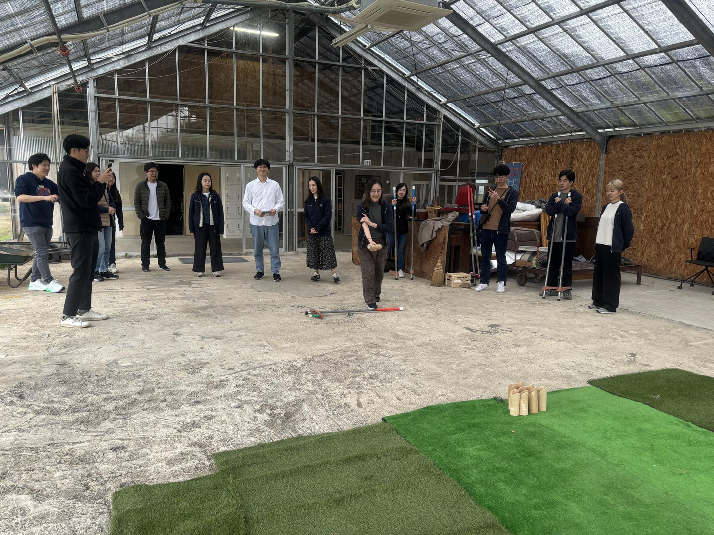2日目のメインイベントは、モルック大会!宿のご好意で屋根のあるスペースをお借りして実施しました。モルックとは、木製ピンを狙って棒を投げ、倒れたピンの点数を競うゲーム。参加メンバーは4つのチームに分かれ、トーナメント形式で試合を進行しました。