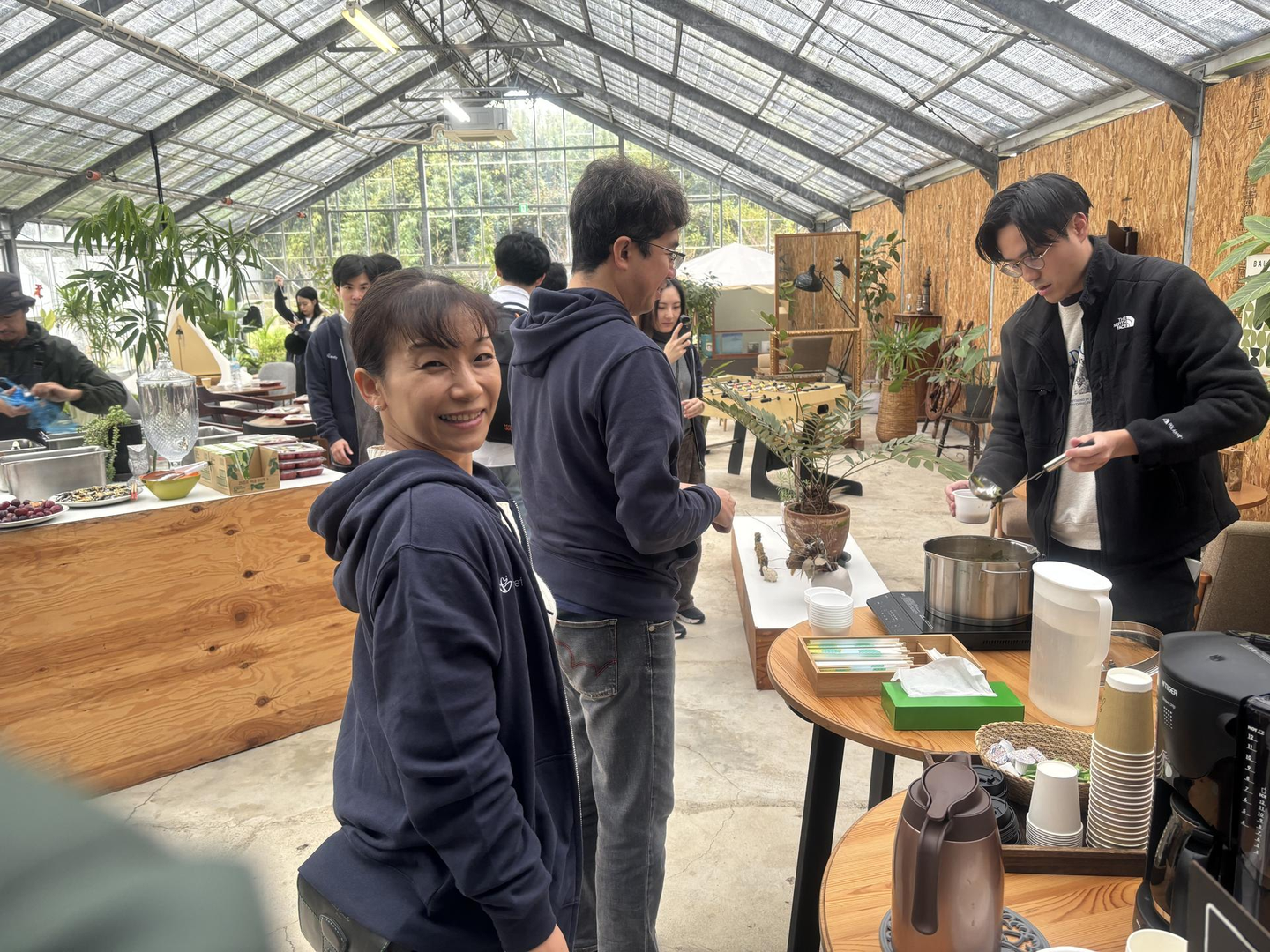 2日目の朝は、あいにくの雨模様。少し肌寒い天気の中、メンバーは前日お昼を食べた場所に集まり、朝食タイム。暖かい味噌汁は、冷えた体と、前夜の飲みすぎ・食べすぎをリセットするように身に染みわたり、メンバーからは「これ、最高にありがたい…」といった声も。静かな雨音の中、リラックスした雰囲気でそれぞれが朝食を楽しみました。
