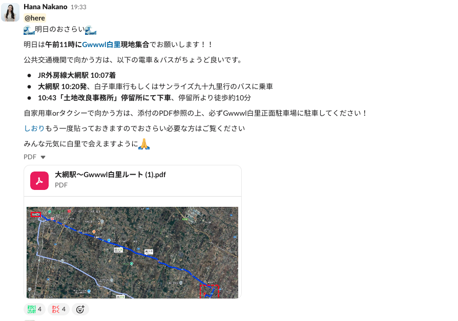 会場の「Gwwwl白里」へは、自宅から各自で移動しました。事前に運営チームが行き方や注意点を丁寧に共有し、Slackに「#2024-shirasato」チャネルを設置して情報をリアルタイムでやり取りできるようにしてくれていたものの、当日はやや波乱のスタートに。