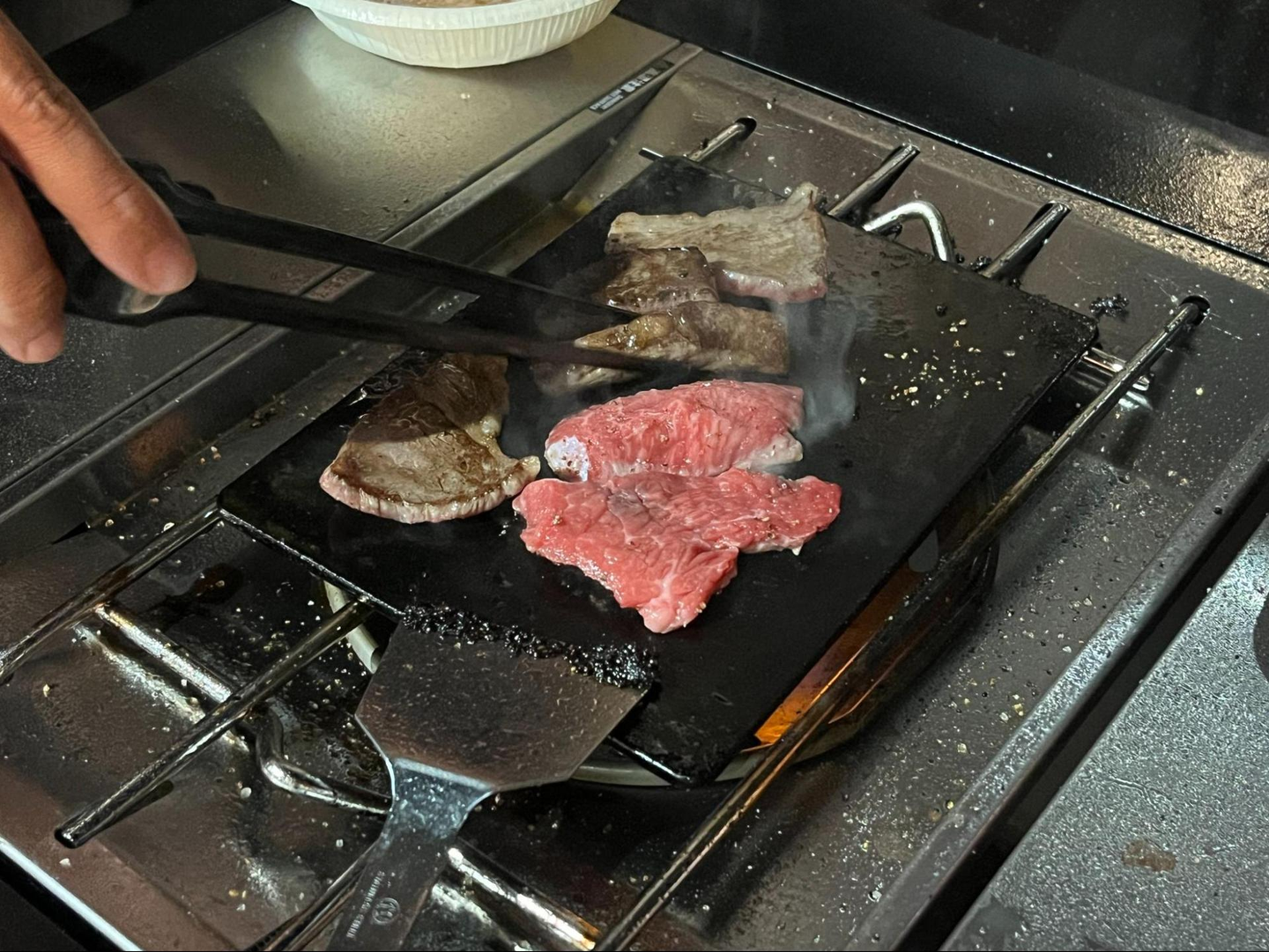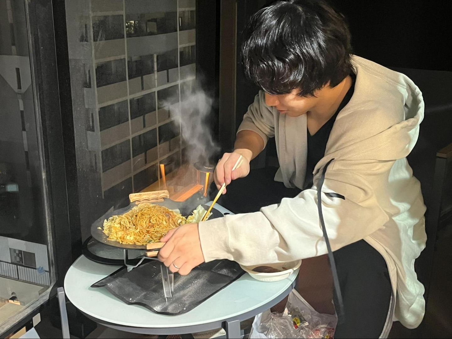 近くのお肉屋さんとスーパーと酒店で買い出しして、バルコニーでほかほかの焼きそば&お肉パーティー!