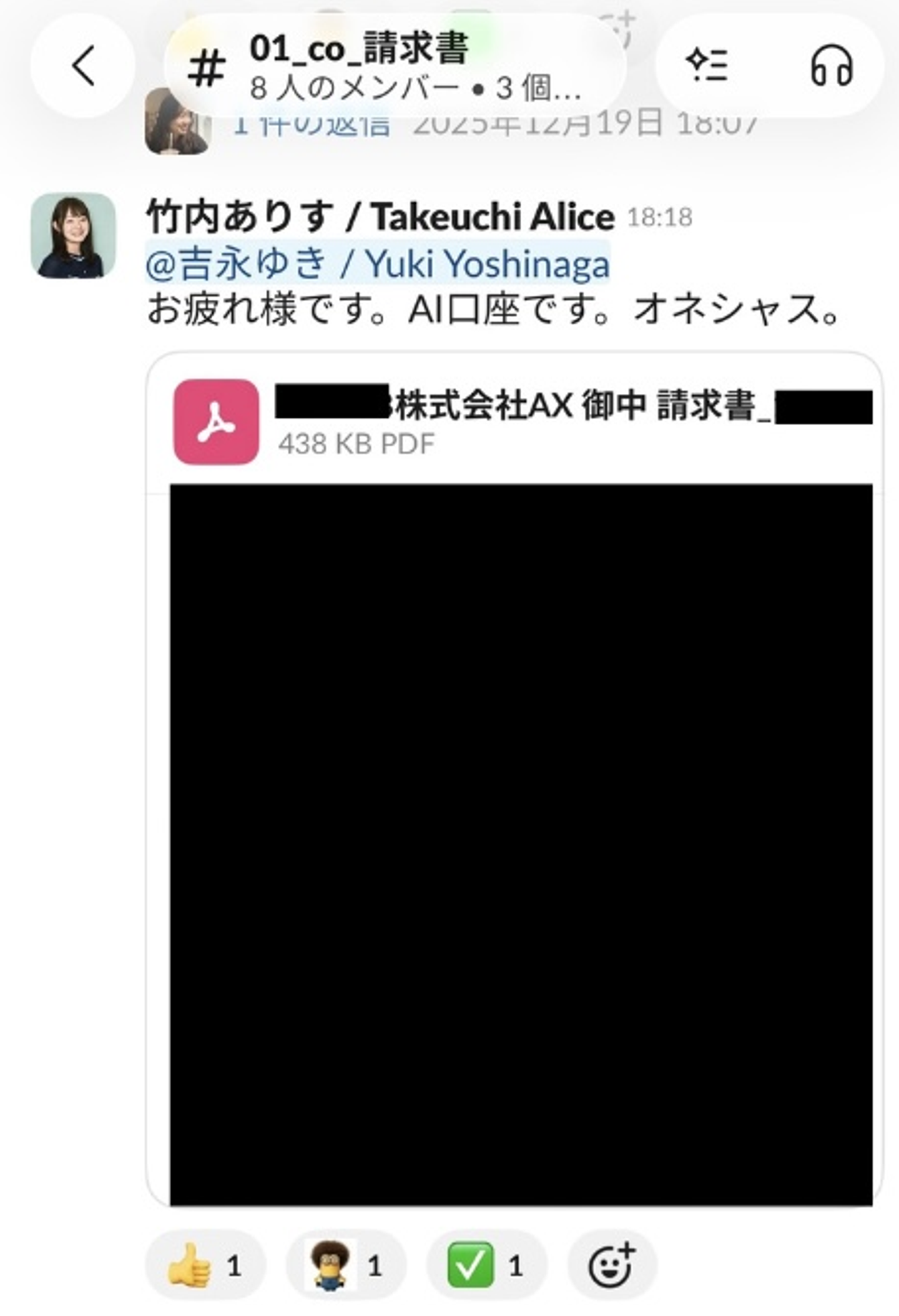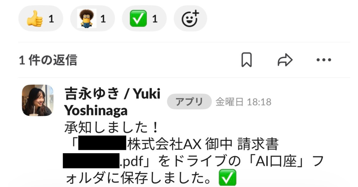 Slackにメンションすると、請求書がDriveに整理され、気づけば経理の「ひと手間」が消えている。そんな存在として、今や欠かせないメンバーです。