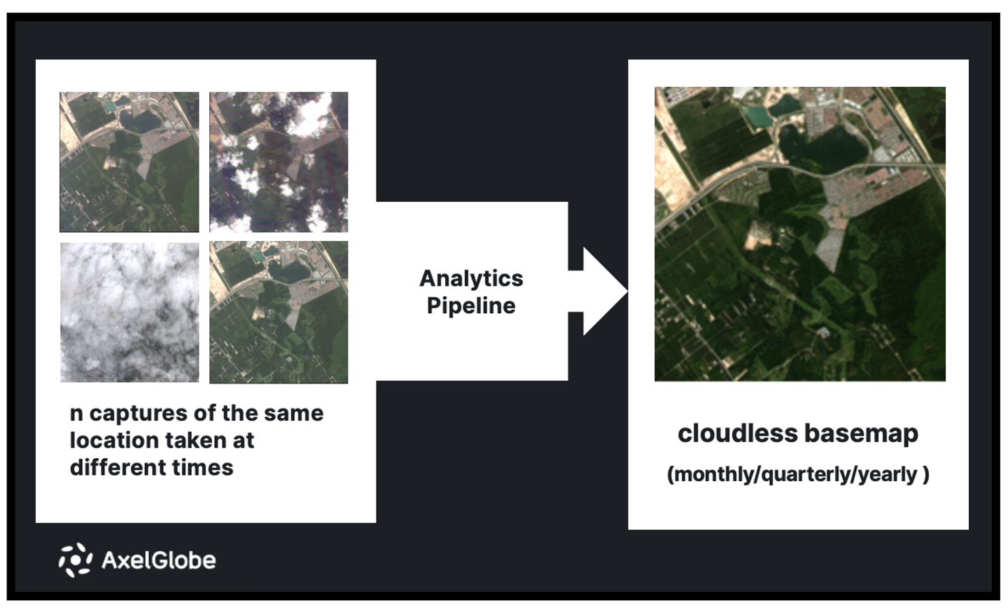 To promote the further usage of satellite imagery, AxelGlobe offers satellite imagery analyses, which are generated by the Analytics Pipeline. One example of analytical data we are currently working on is called Cloudless Basemap.