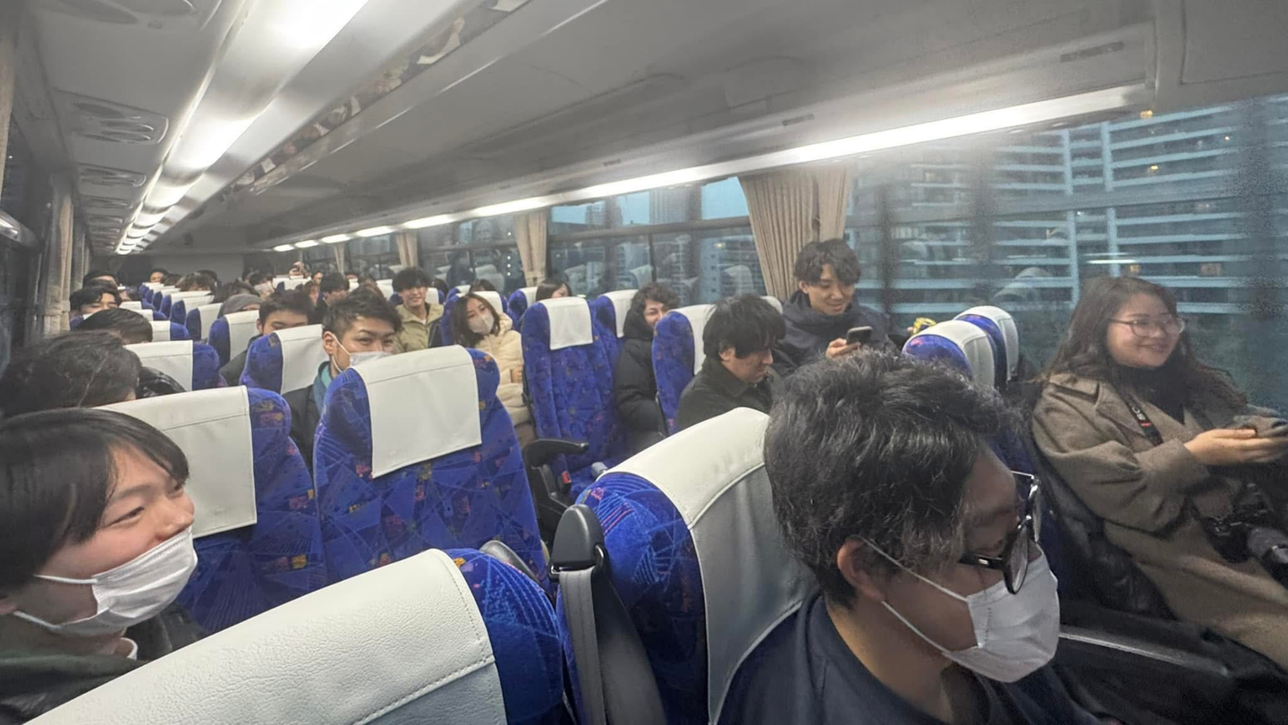 当日の夕方にはその日の仕事を切り上げ、オフィスから貸切りの大型バスにて全員で移動するところからスタートです!