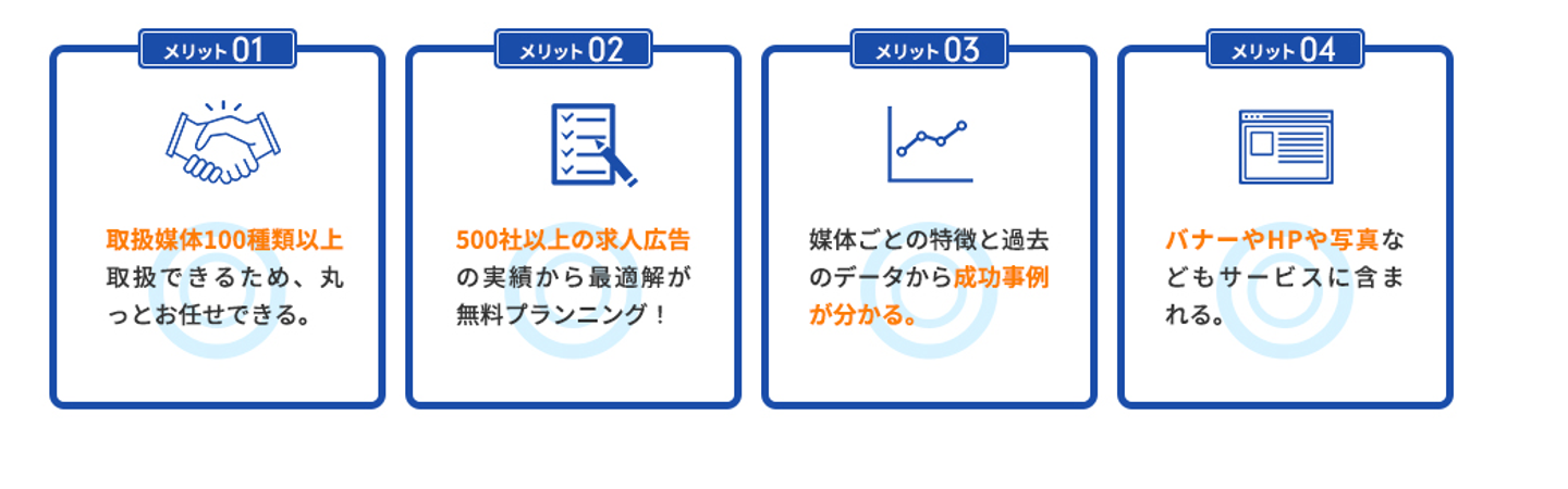 広告のみならず、採用の企画から育成までのトータルサポートも可能で、採用に関すあらゆるお悩みを解決できます。