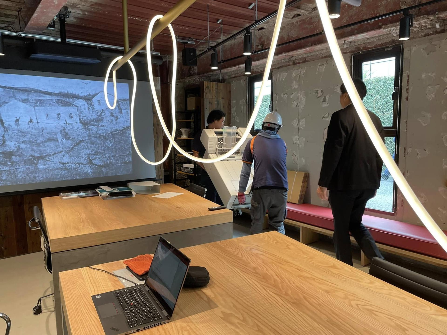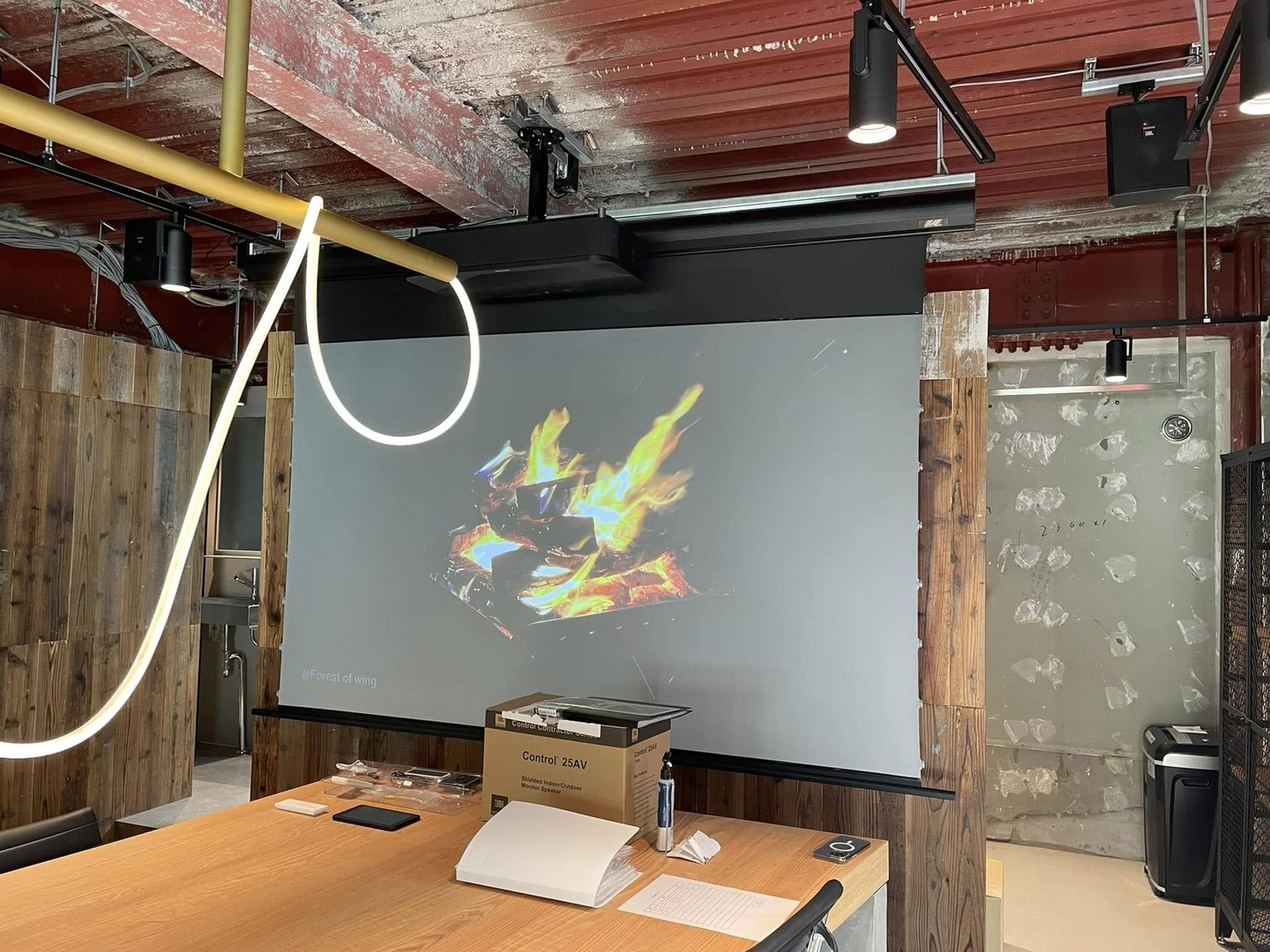 オフィス奥のプロジェクターで早速たき火の映像を。ただ部品が足りなかったトラブルがあり、フルサイズでの投影ができるようになるにはここから2週間強かかるのでした