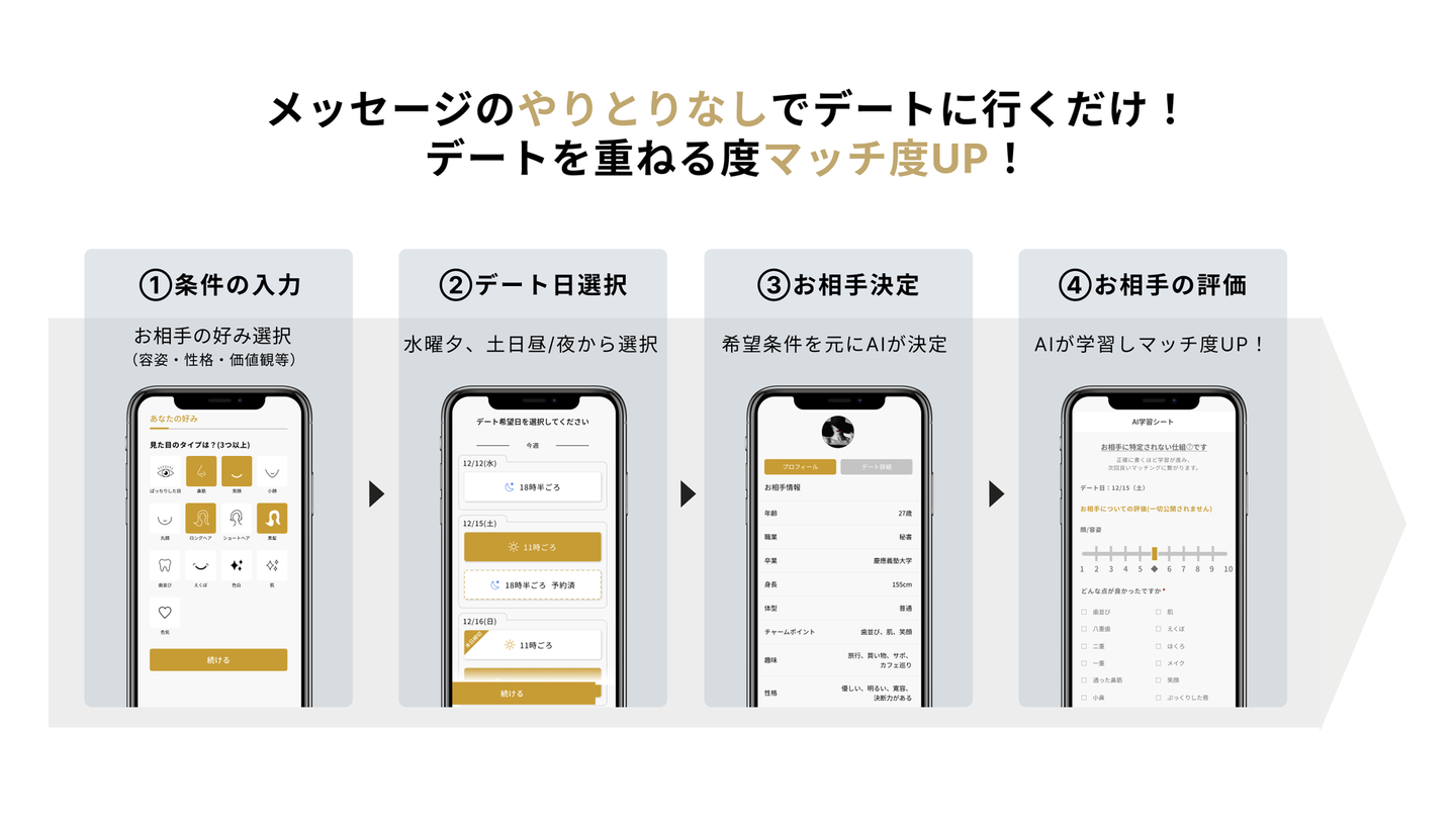 バチェラーデートは、「忙しくて時間がない」「恋愛は後回しにしてきた」という現代人の課題に応えるサービスです。「やりたいことを犠牲にせず、恋愛や大切な人との時間を諦めない」。この新しい価値観を提案することで、多くの人が前向きに生きられる社会を目指しています。
