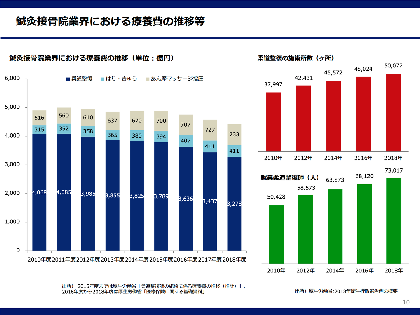 アトラグループ株式会社のIR資料によると、柔道整復の療養費マーケットは3,278億円あることが示されており、柔道整復の施術所数は増加していますが、年々このマーケットは尻すぼみになってきていることが分かります(保険から自費診療にマーケットが移り変わっています)。