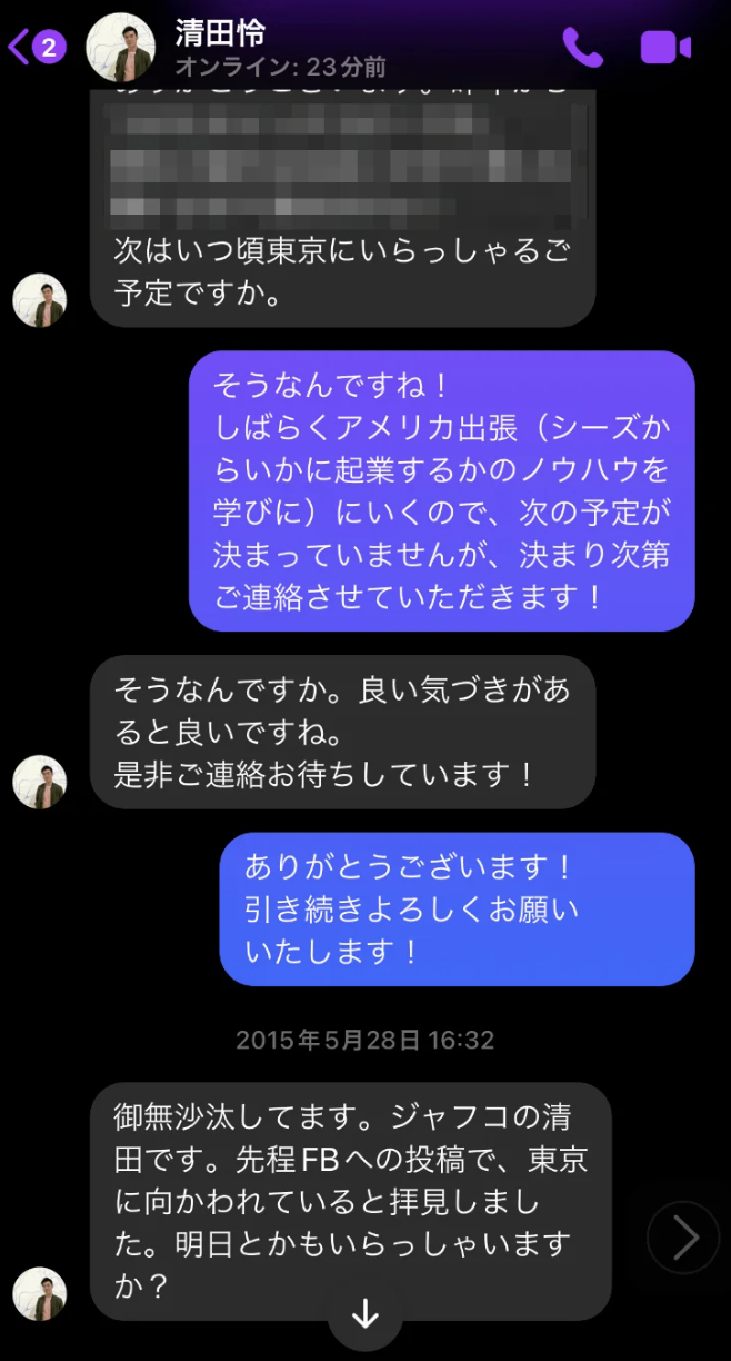 そのタイミングを見て、東京来た際はぜひお会いしましょう!とのメッセージを頂きながら、私からメッセージを送付することを失念しており、私のFacebookの投稿をみて、清田さんからメッセージをいただくという失態をしていたことを、振り返って気づき、大変失礼なことをしたなと思っていますw
