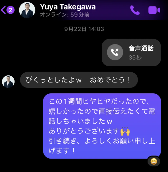 そんな気持ちをシード期から支えてくださっているCAC竹川さんにその場で伝えたくて、テキストではなく生の声で伝えたくて、いつもメッセージしかないのに、気づいたらTELの発信ボタンを押していましたw
