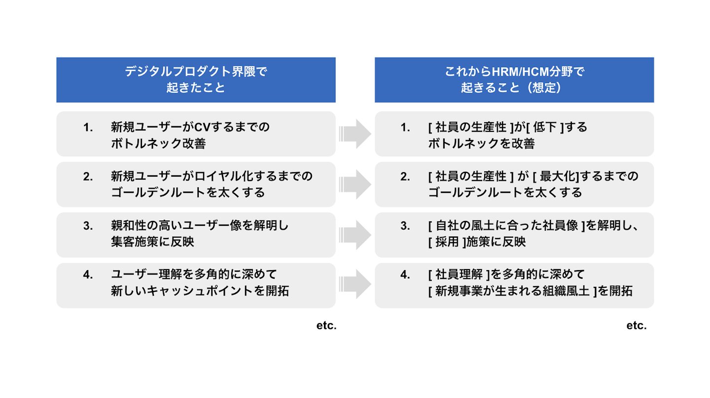 デジタルプロダクト界隈で起きたことは、今後「人的資本経営」の名の下、 HRMやHCMの領域でも、近しい世界観に深化していくものと思います。