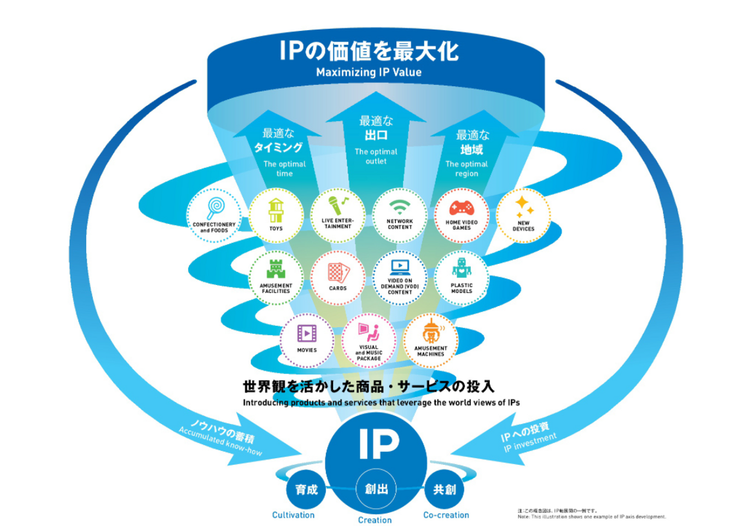 キャラクターマーチャンダイジングというビジネスモデル特性のため、バンダイナムコグループでは、「各IPをエリア毎に最適な商品・サービスとして展開していくIP軸戦略」を取っています。