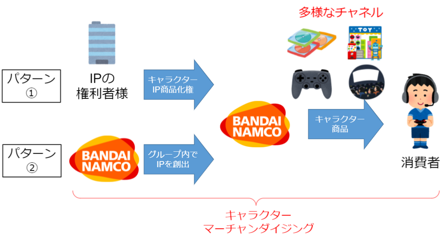 IPの権利者様からキャラクターの商品化権を取得し、ゲームやトイホビーといった様々なチャネルでキャラクター商品を消費者に届ける「キャラクターマーチャンダイジング」というビジネスモデルを取っています。(下記図のパターン1を参照)