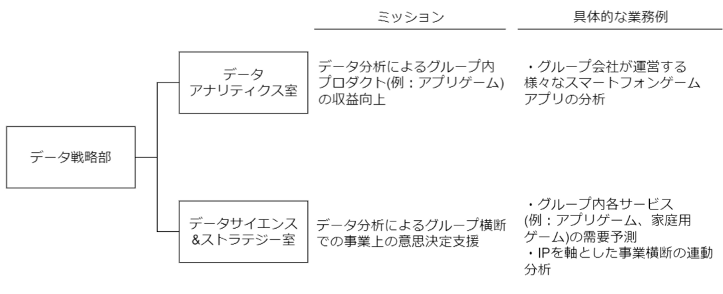 下記図のように、データ戦略部は「データアナリティクス室」と「データサイエンス&ストラテジー室」の2つの室で構成されています。