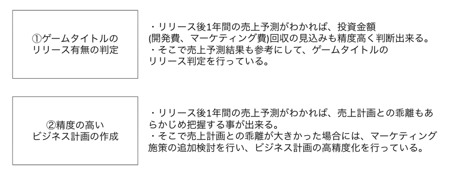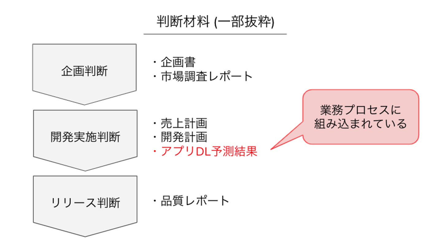 下記図のように、アプリDL予測結果はゲームタイトルの開発実施判断に利用されています。