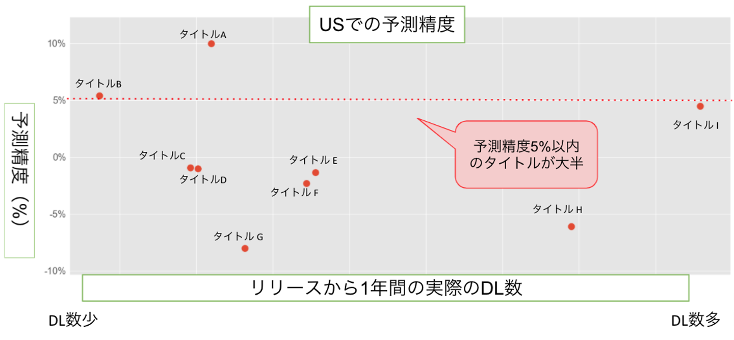 下記図はUS市場でリリースをした9個のゲームタイトル(タイトルA~I)を用いて、予測精度を検証したものになります。
