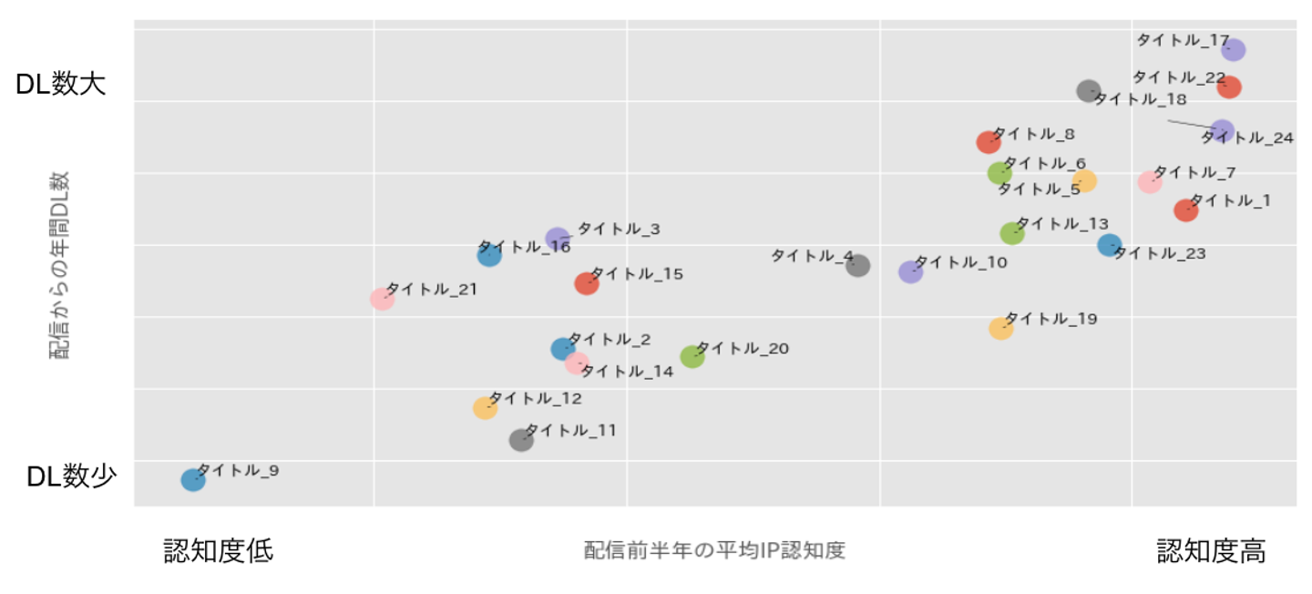 アプリDL数に影響を与える要素を分析していく中で、リリース前のIP認知度とアプリDL数に相関があるのではという仮説を立てました。