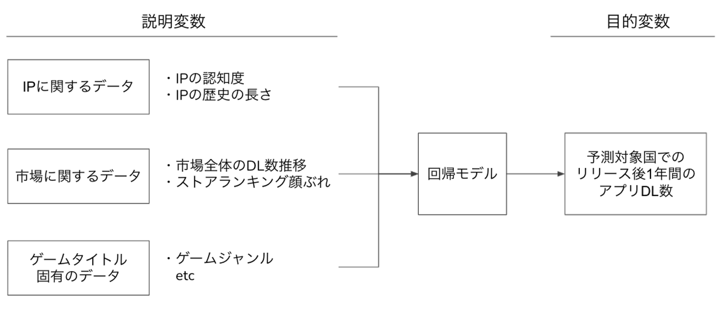 そこで、リリース前でも利用可能な「IPに関するデータ」、「(アプリ)市場に関するデータ」、「 ゲームタイトル固有のデータ」を用いて予測を行っています。