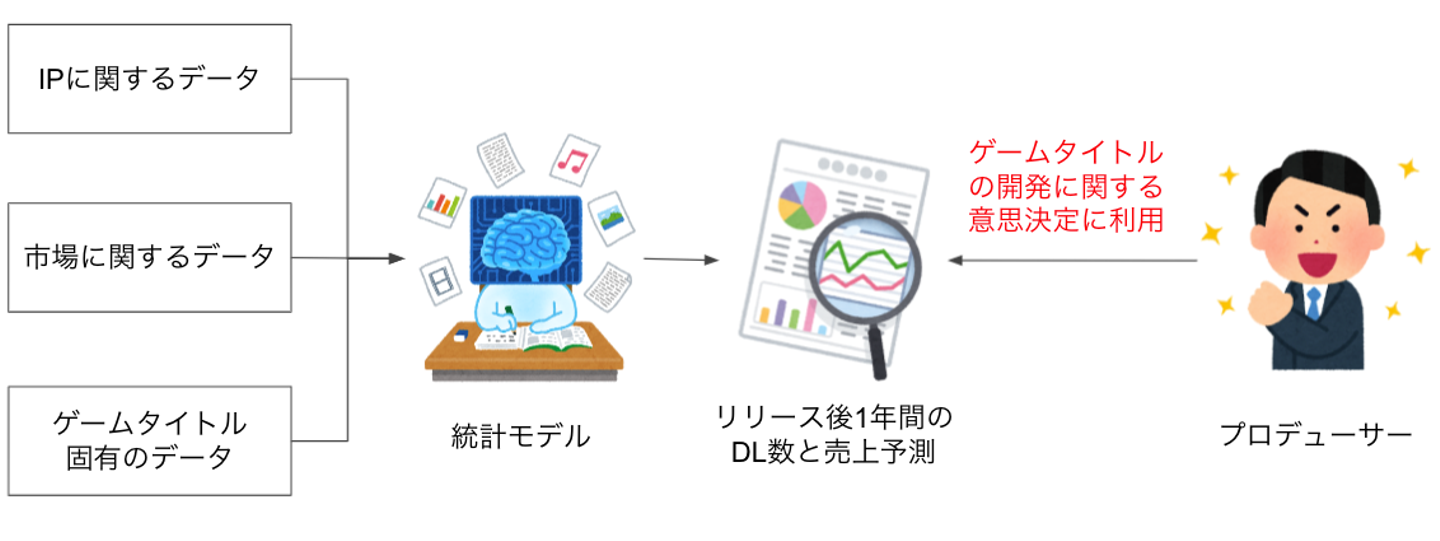 そしてゲームタイトル担当プロデューサーが予測結果を参考にして、ゲームタイトルの開発の意思決定や開発計画の修正を行います。