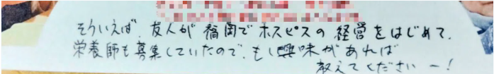 幼馴染からのメッセージには、ホスピス住宅「ビーズの家」が開設されること、そして管理栄養士を探していることが書かれていました。