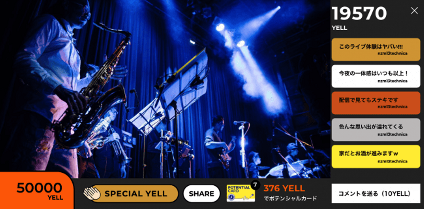 まず最初の特徴が「YELL」の機能です。YELL(英語で「応援」を意味する)とは、MUSERのサービス内デジタルマネーです。このYELLを使うことで、MUSER内の「配信チケットの購入」、「アーティストへの投げ銭」や「アーティストカードの購入」をすることができます。