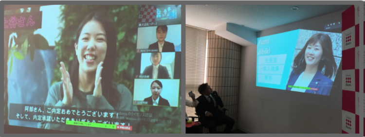今回、内定者全員が集まることができなかったので、会社としてサプライズ企画で先輩社員からのお祝いムービーを作成し実際に上映いたしました!内定者一人一人に対して、選考中にお会いした先輩社員がお祝いの言葉をお伝えしました。
